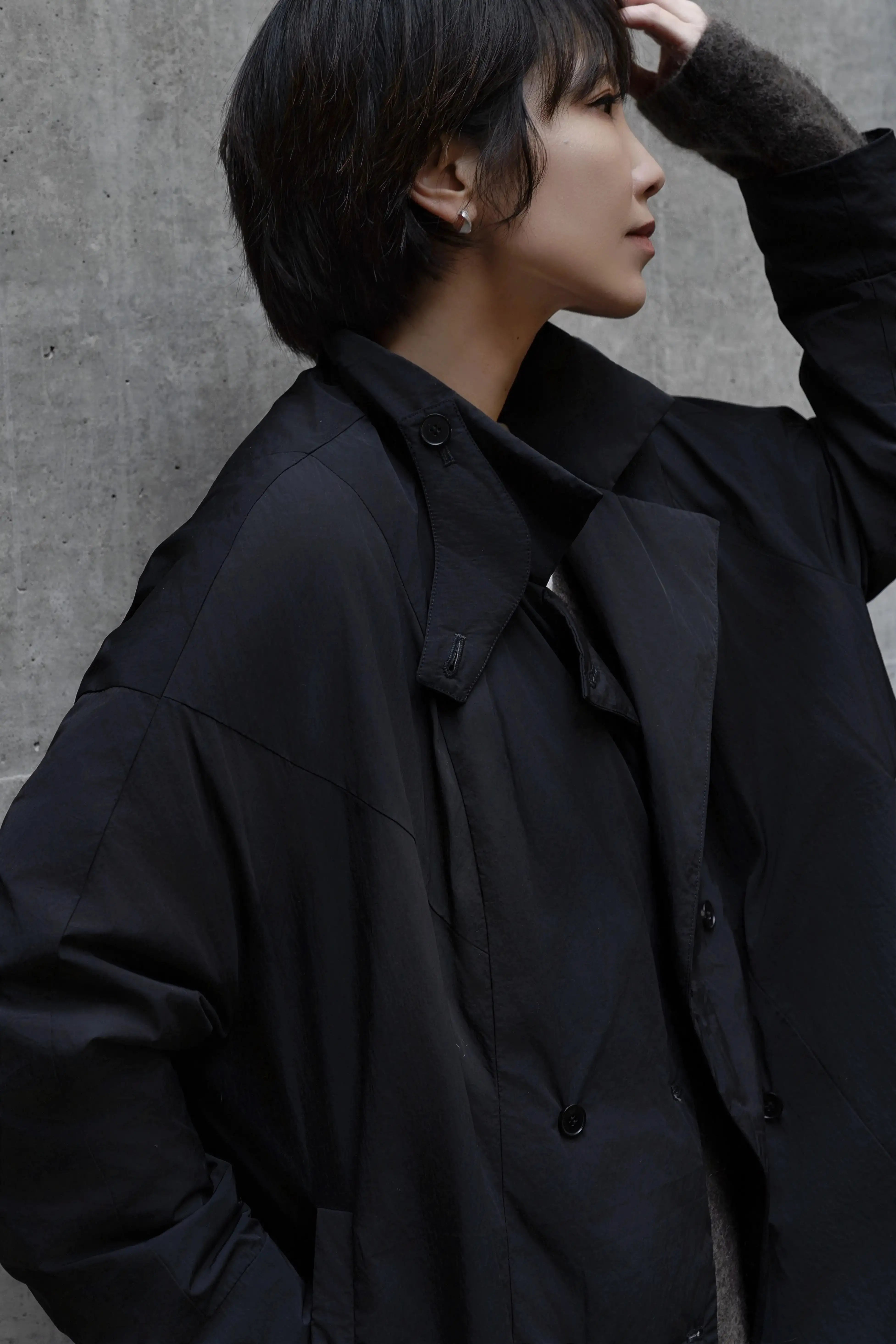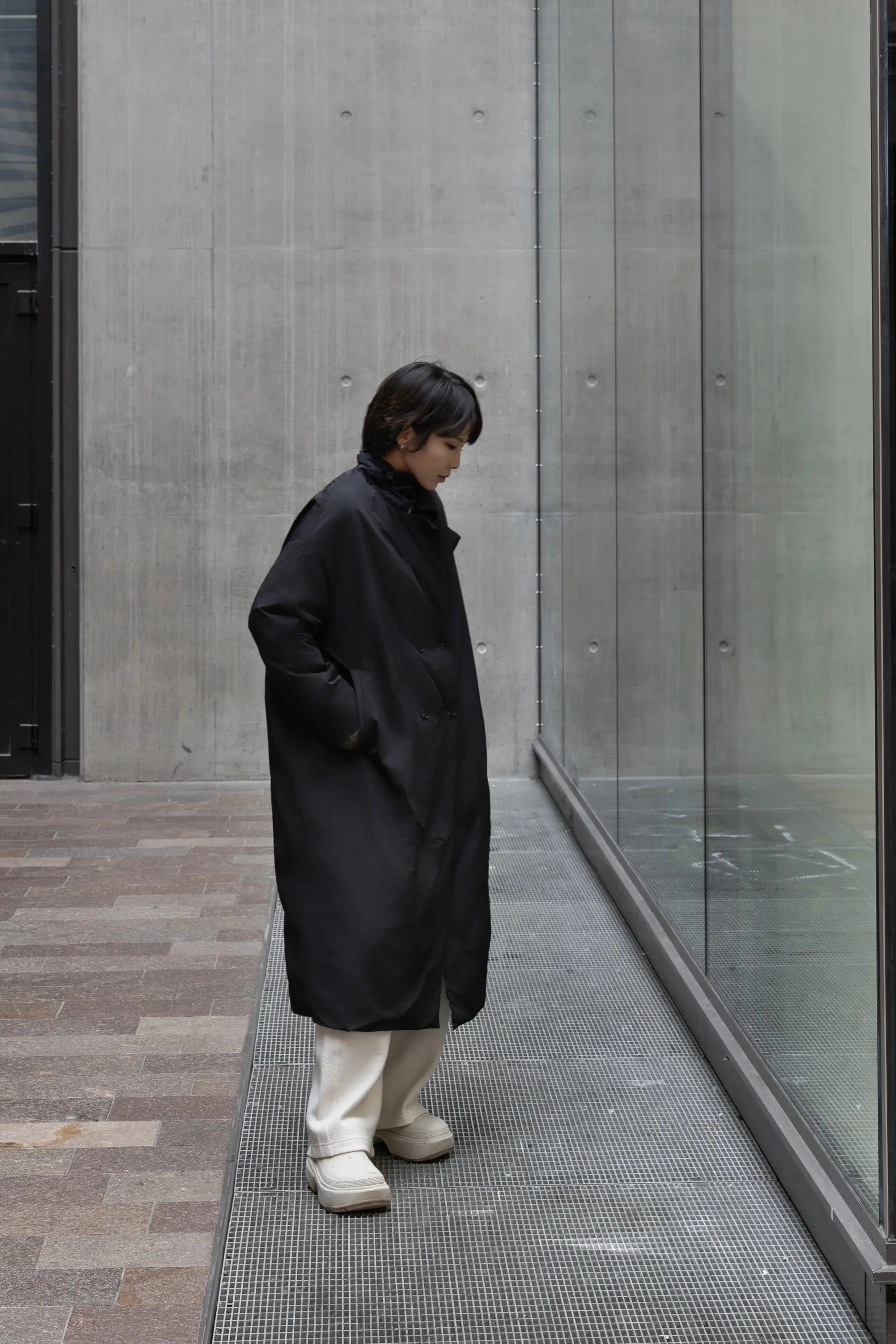 Black oversized long down coat with a crisp nylon shell and relaxed, drop-shoulder silhouette. Filled with around 85g of 90% white goose down, it offers light, cosy warmth for London and other city winters without heavy bulk.