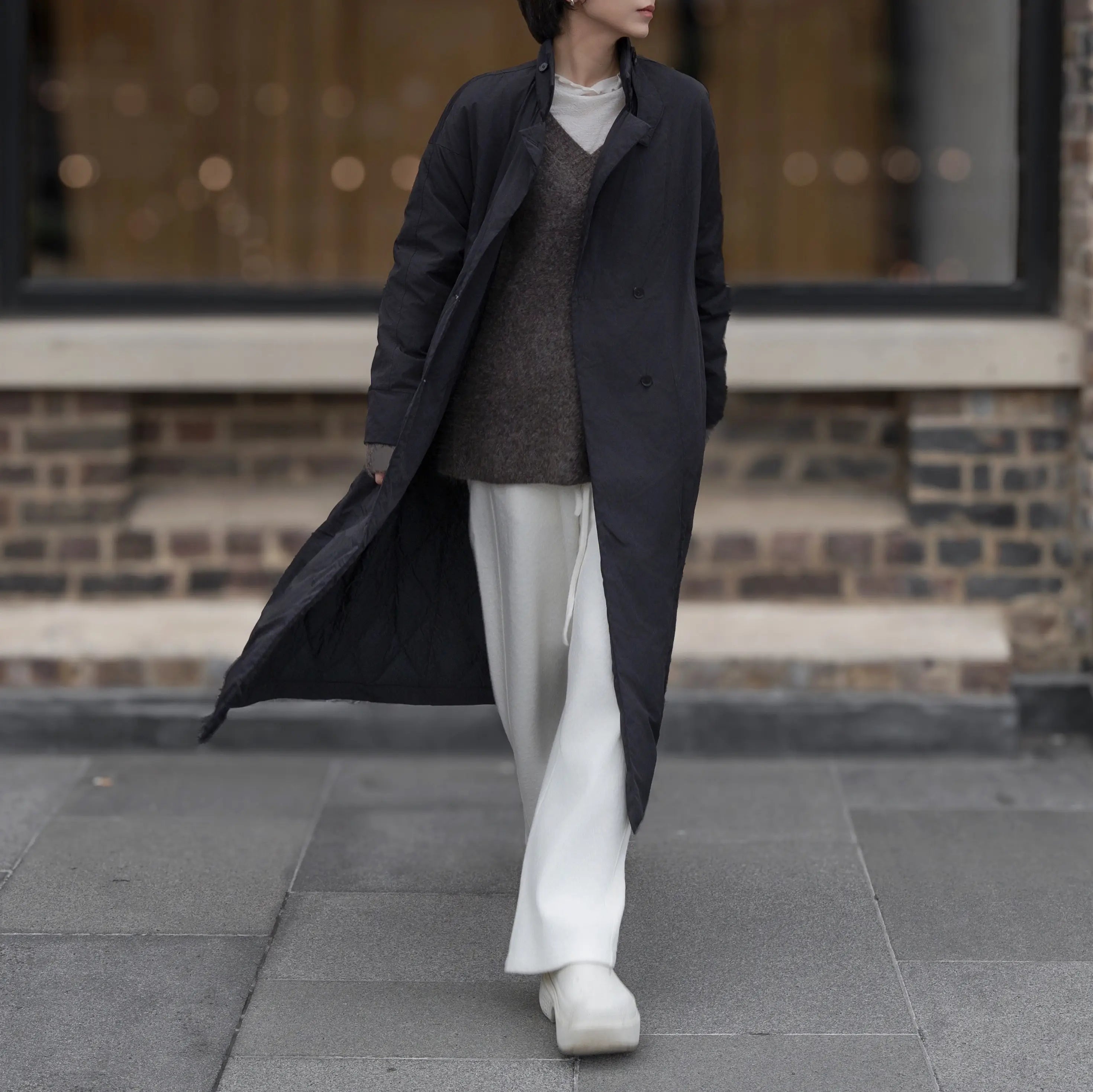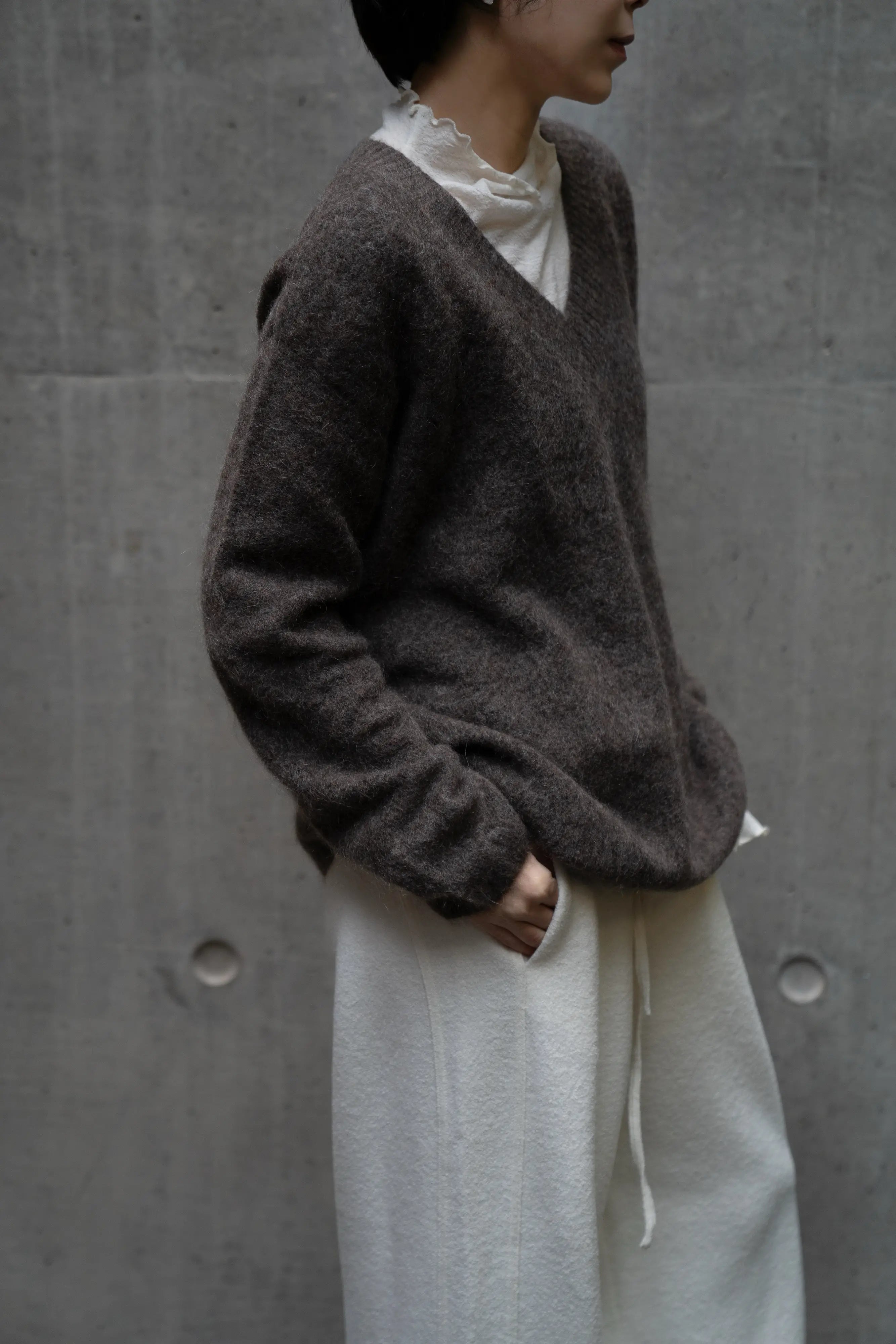 Brown V-neck mohair sweater in a 65% extra-fine mohair blend, with a soft, fuzzy halo and relaxed drop-shoulder fit. The slightly deeper V and clean straight hem make it easy to wear on its own or layered over a tee or thin turtleneck for quiet, cosy winter days.