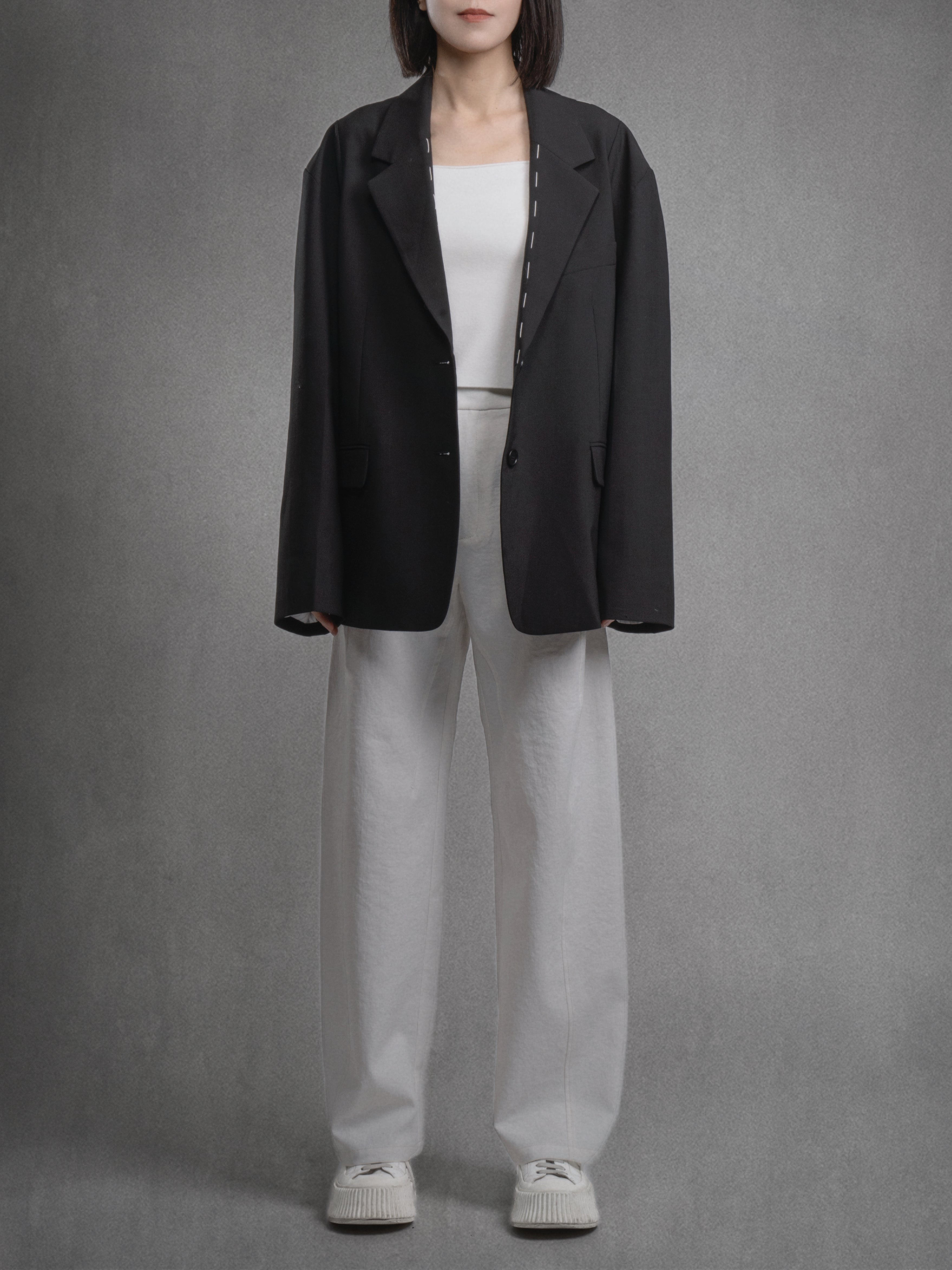 Crafted from a wool-blend with gentle stretch, this jacket holds a soft structure while staying warm and comfortable. Dropped shoulders and exposed topstitching create a relaxed outline, complemented by rolled cuffs showing the subtle striped lining. A versatile layer that pairs effortlessly with dresses, shorts, or tailored trousers across seasons.