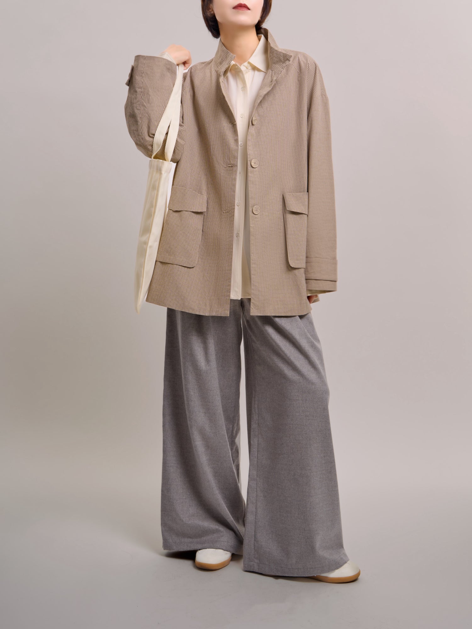 Crafted from breathable fine-check cotton, this jacket offers a soft, natural feel with a clean, relaxed structure. The dropped shoulders and minimal lines create an easy silhouette that layers effortlessly across seasons. A versatile staple designed for quiet everyday dressing and refined combinations.