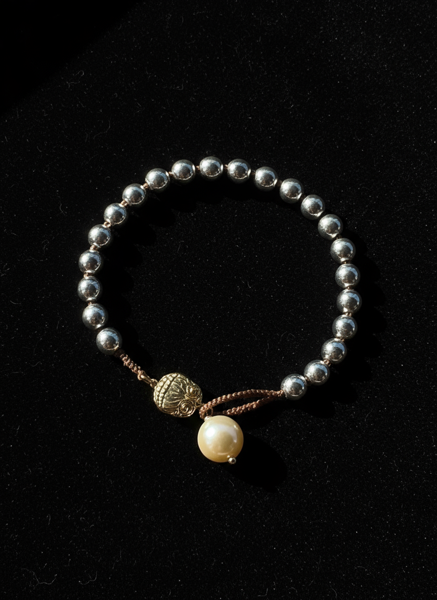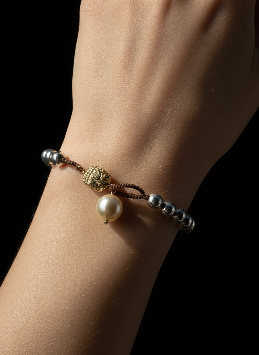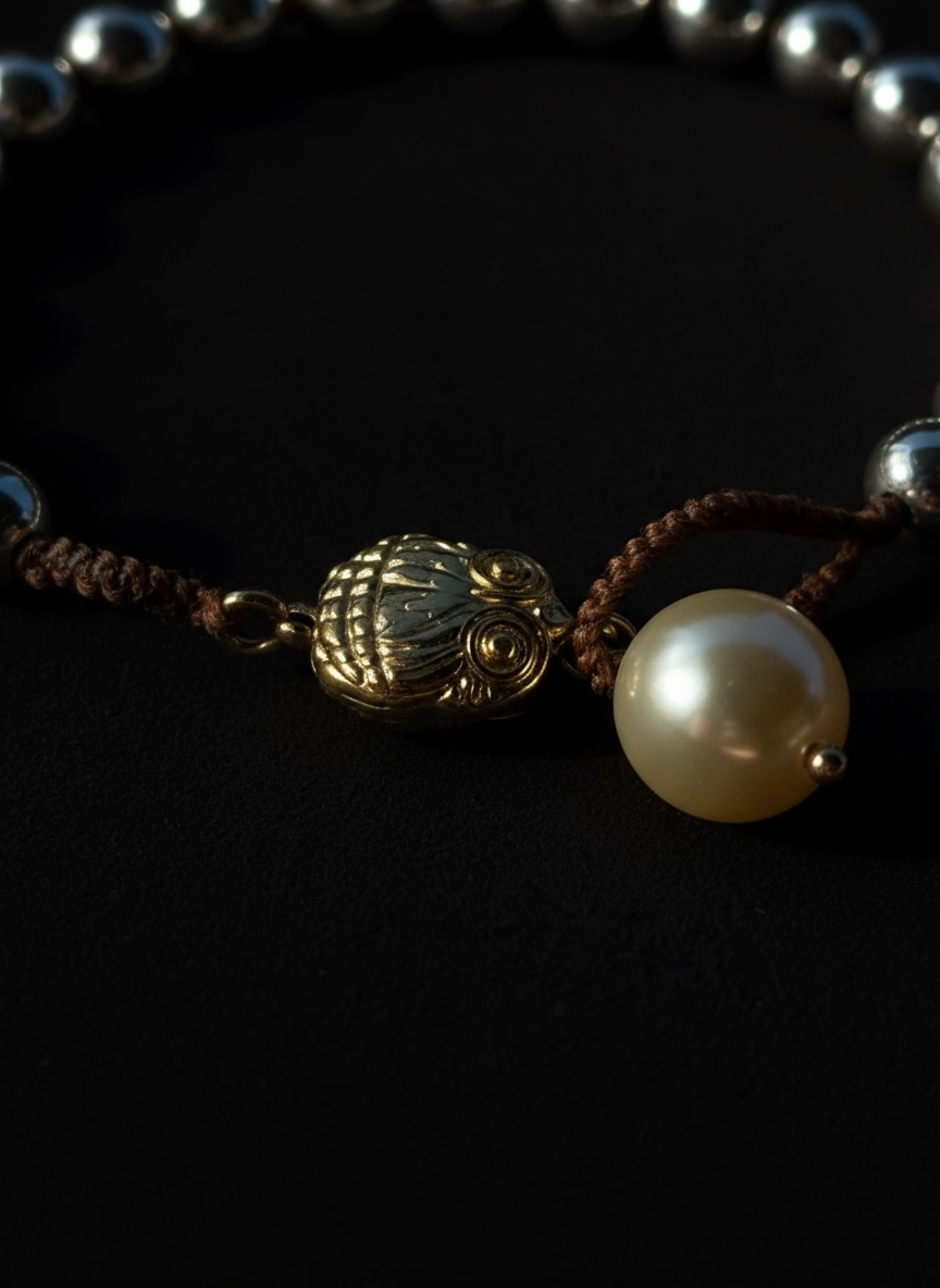 Matte obsidian beads create a grounded, understated rhythm, complemented by a polished gold-plated clasp and a single pearl accent. The piece carries a quiet sense of strength with a clean, modern profile. Designed for women who value balance and clarity in the details they choose to wear.