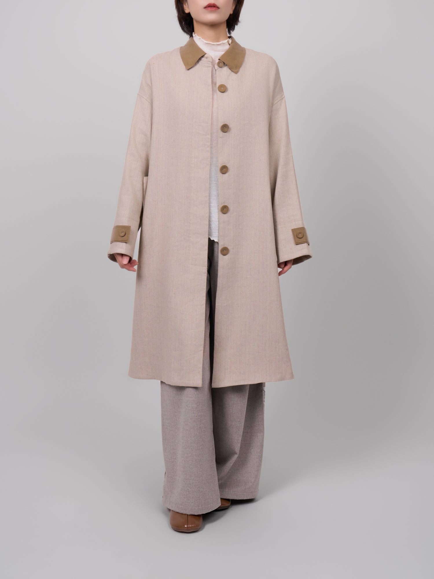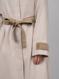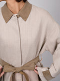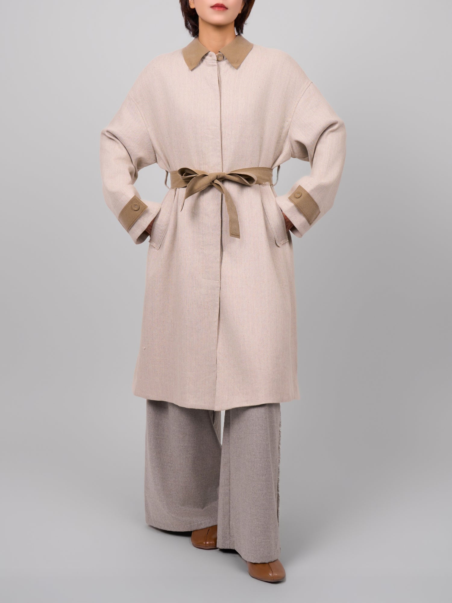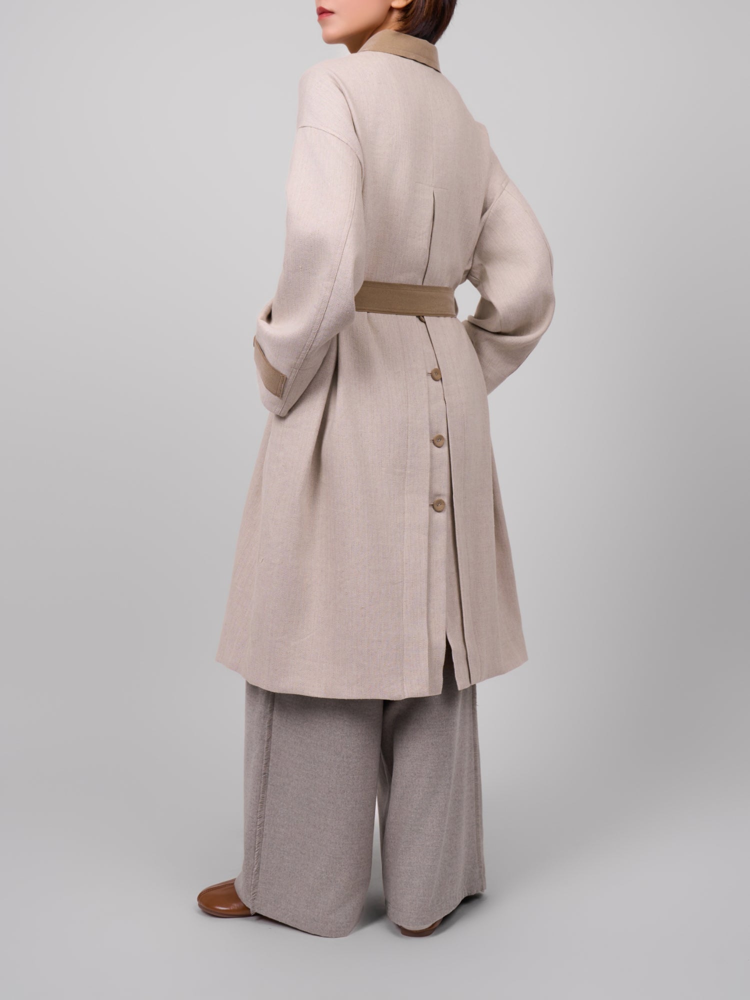 Design — Nomadic-inspired cocoon silhouette with suede-brown contrast collar and cuffs. Features a clean hidden placket, detachable belt, and back vent with raw-edge pocket details, reflecting effortless freedom and natural ease.