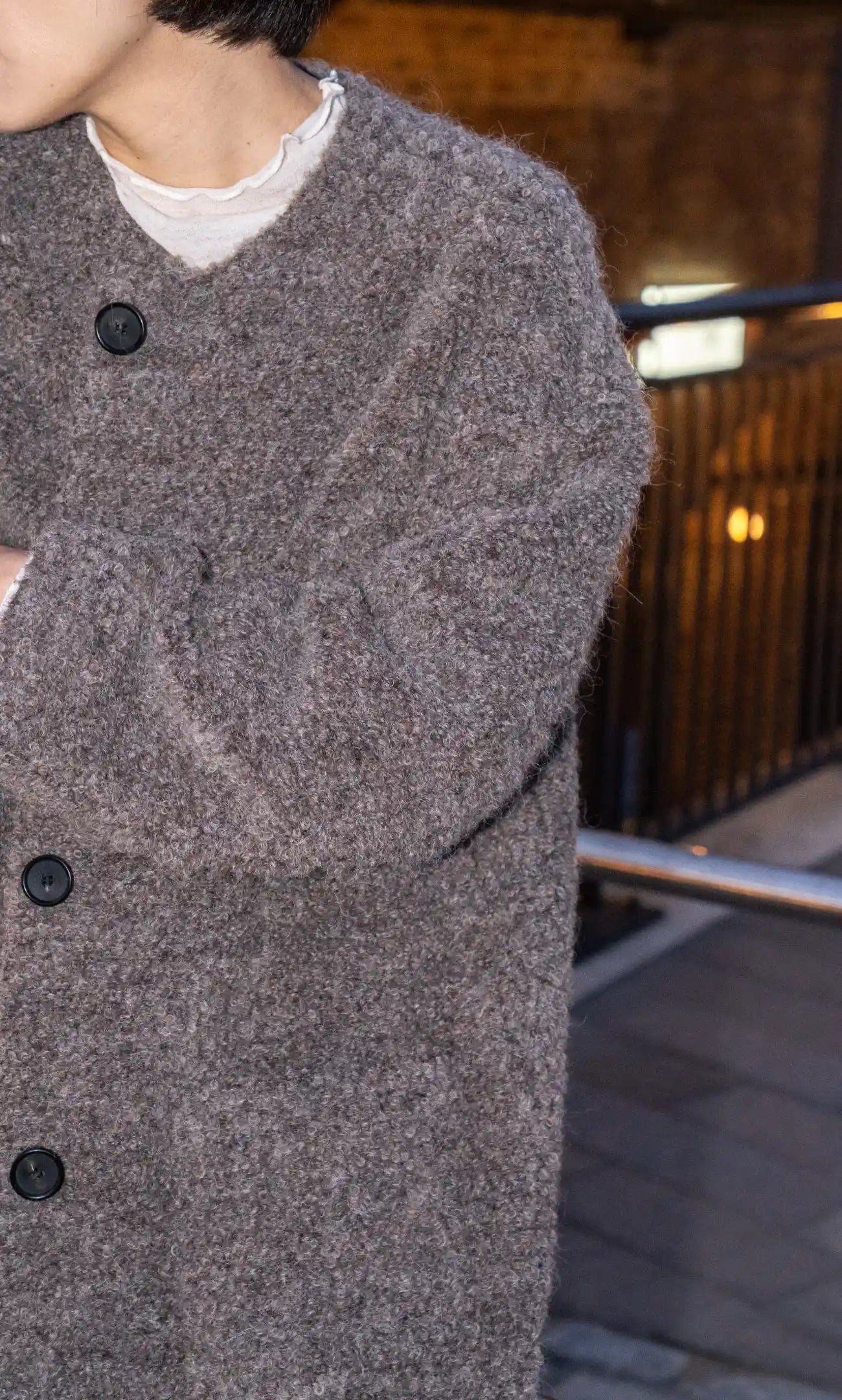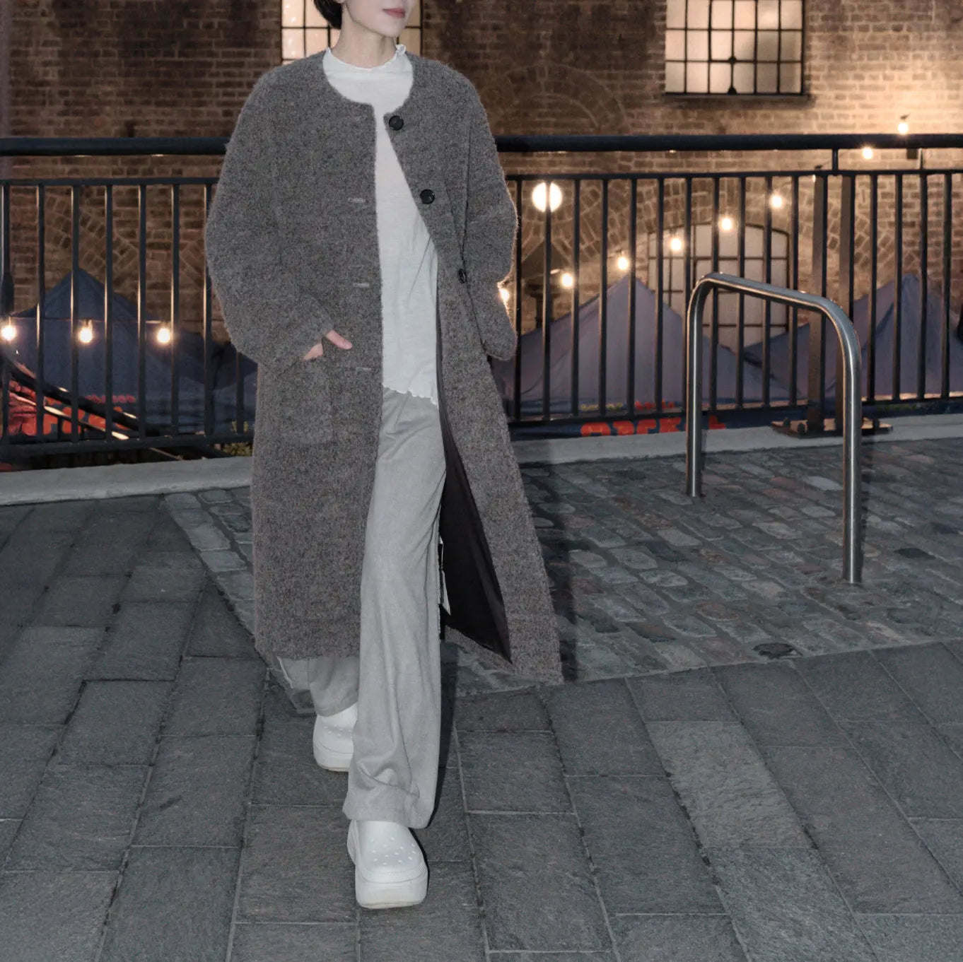 这款大衣采用羊驼毛和羊毛混纺面料,质地柔软,垂坠感极佳,带来天然温暖。无领设计搭配柔和的灰色调,打造出精致现代的廓形,尽显沉稳气质。作为一款百搭的冬季外套,它可轻松搭配针织衫、连衣裙或修身长裤,展现低调优雅的气质。